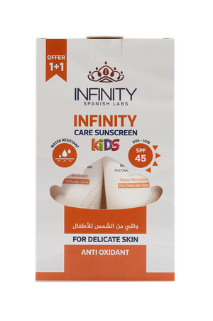 نقدّم لكِ Infinity Care Sunscreen Kids SPF45 – Promopack، الحل الأمثل لحماية بشرة طفلك الحساسة من أشعة الشمس الضارة. بتركيبة مرطّبة ومقاومة للماء، يوفر واقي الشمس حماية موثوقة بمعامل SPF45+ ليحافظ على بشرة طفلك آمنة من الأشعة فوق البنفسجية وحروق الشمس أثناء اللعب أو الأنشطة الخارجية.